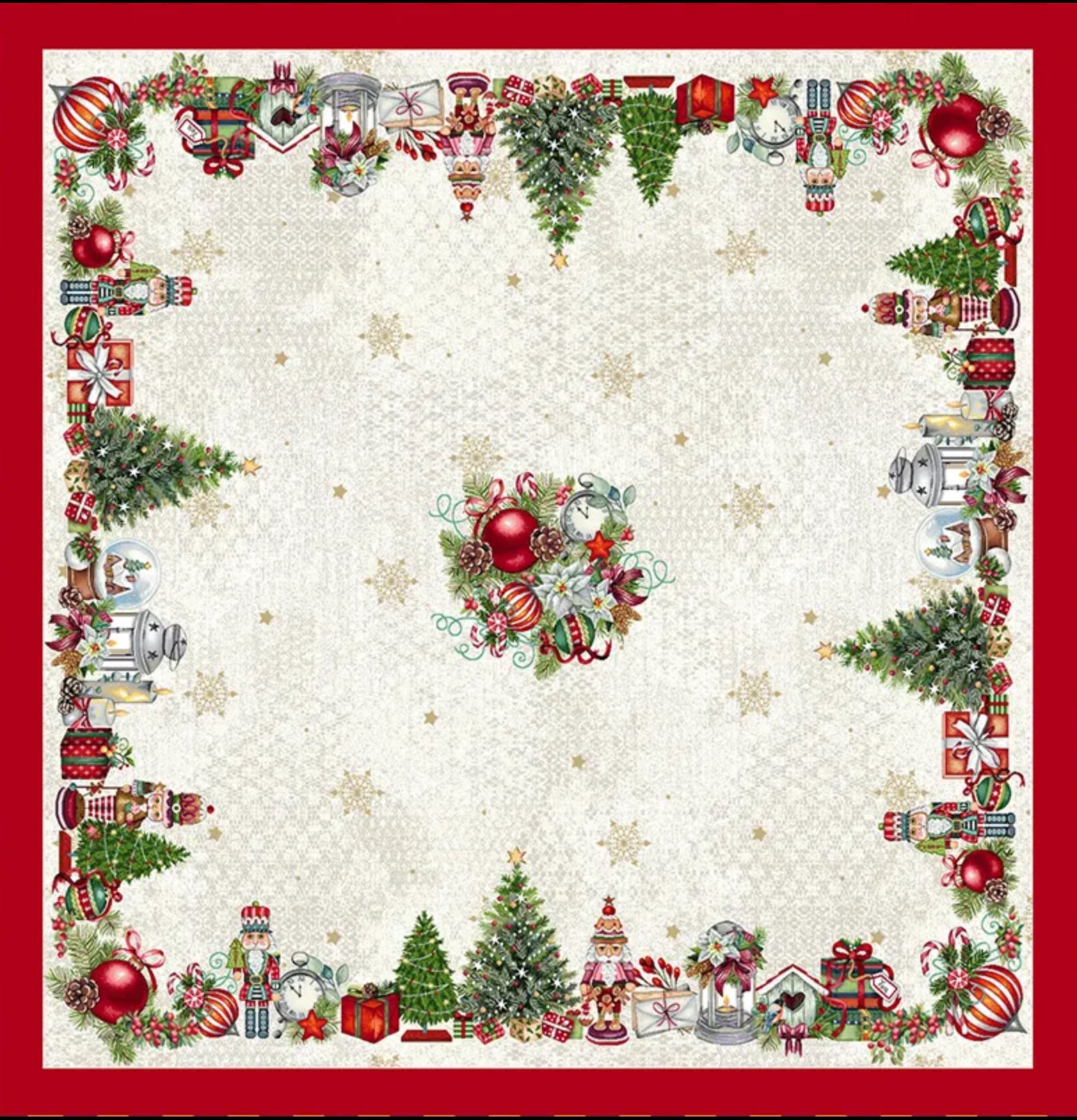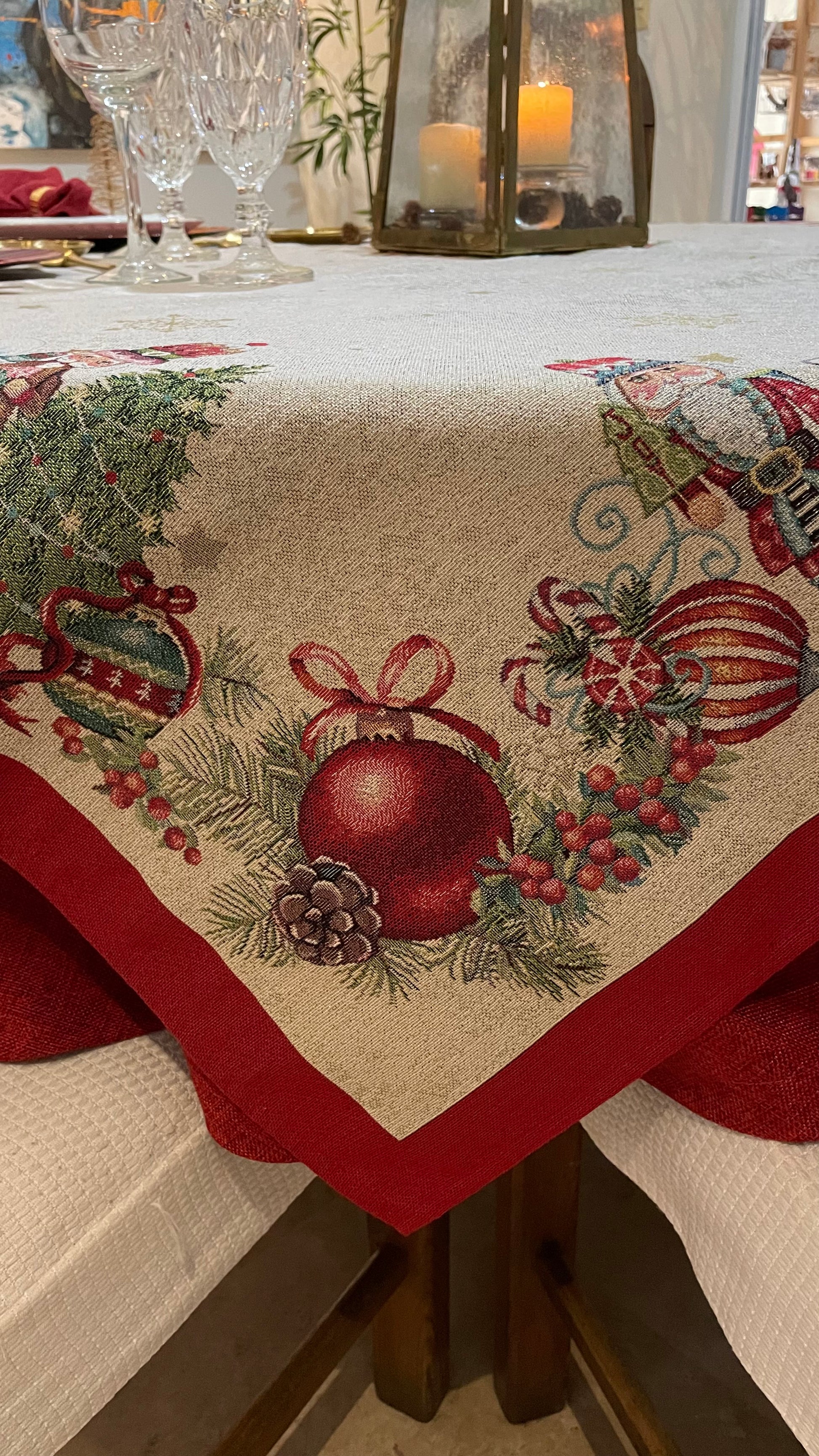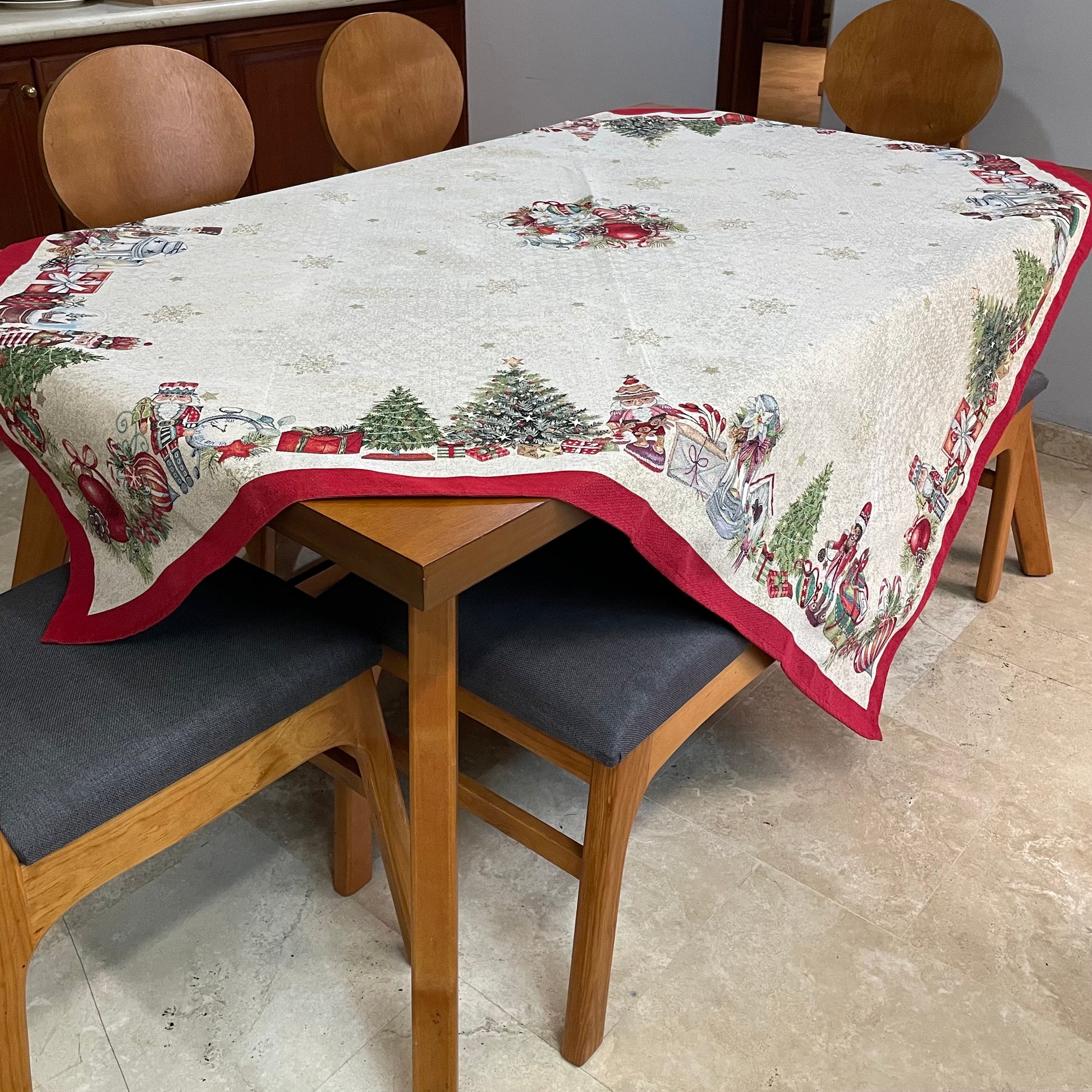 Un elegante mantel donde todo el perímetro lleva un ribete rojo y estampado de juguetes y figuras características de la tradición navideña.